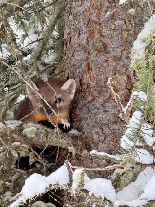 Coach Rob on his nearly daily tour around our trails managed to capture a great shot of a pine marten on the upper section of Moose Loop yesterday, amazing shot, thanks so much Coach Rob! Keep your eyes peeled on your next Trail Creek Nordic adventure and you might spot it too. The bigger tracks below are the distinctive pine marten tracks, the smaller tracks are those of a squirrel that might have been in trouble…