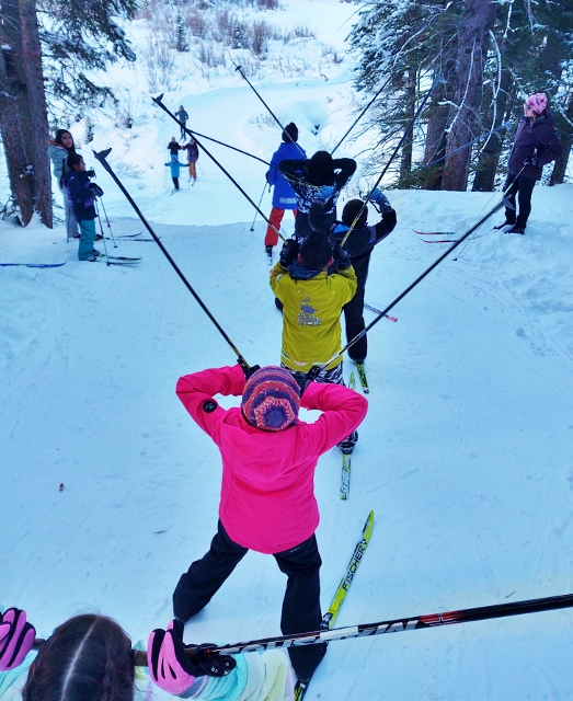 The Masters team then used a short tour to help us coordinate our new knowledge and finished up with a diminishing equipment relay. Games are just as important for adults to learn Nordic skiing as they are for student athletes. Games help us get out of our heads and just ski for fun!