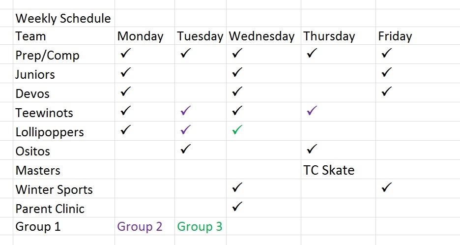The midday team is wrapping up practice in early February, but the master's crew will continue to offer parent clinics at 4:00 on some Wednesdays. These short clinics cover technique, equipment, waxing, and any other questions that are holding back your Nordic skiing. Look for an announcement about new dates in the upcoming weeks.