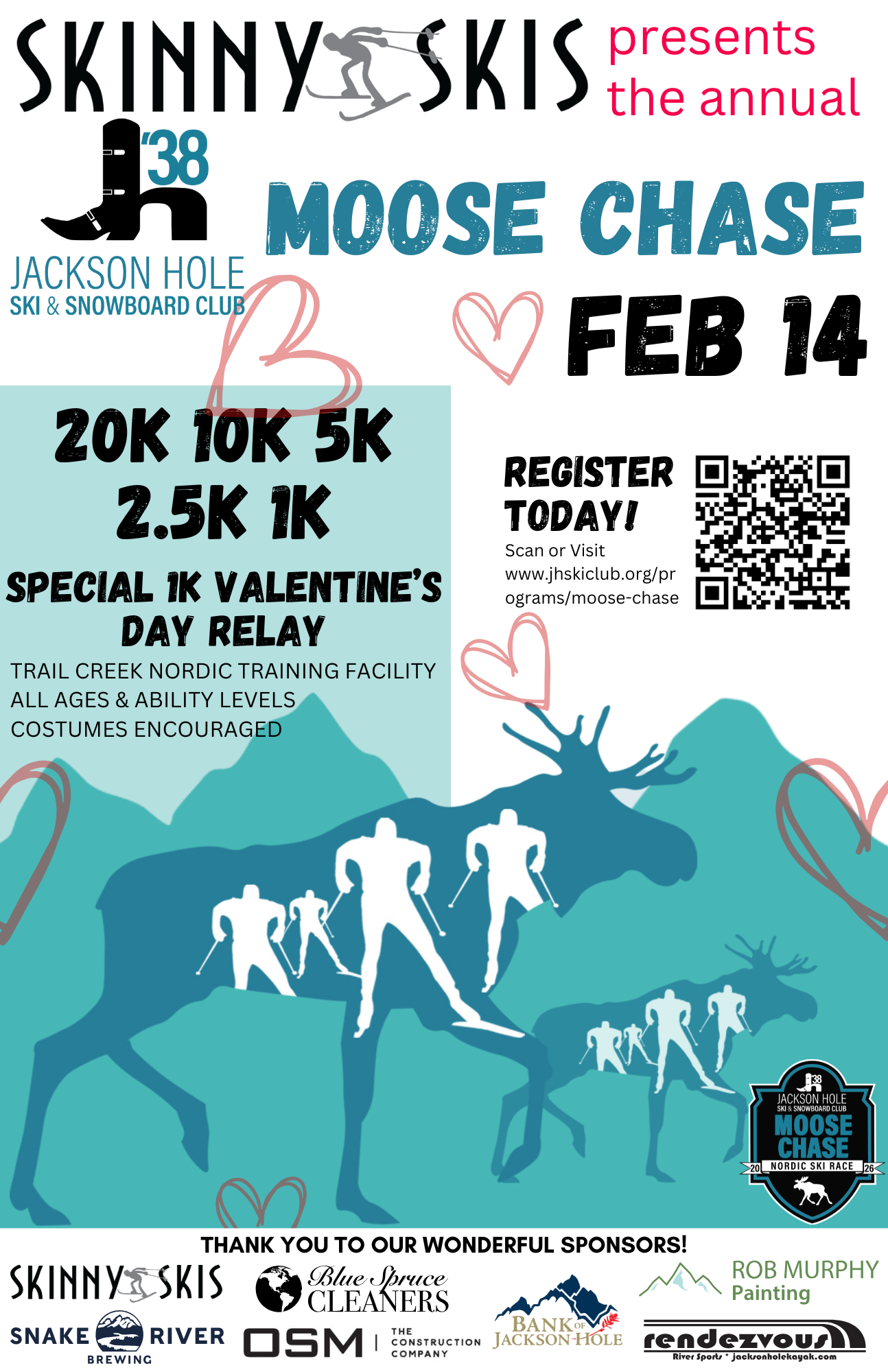The 30th (mostly) Annual Skinny Skis Moose Chase Nordic Ski Race will be held at Trail Creek Nordic Training Facility in Wilson, WY, on February 14, 2026.